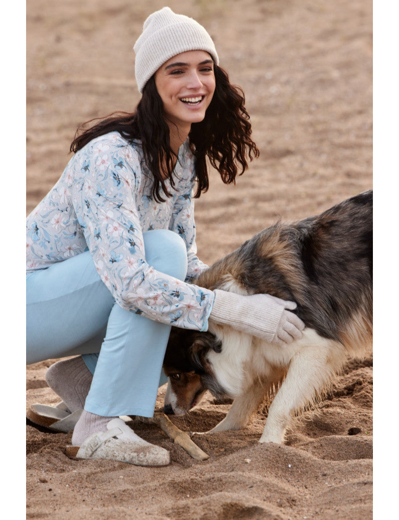 Un pijama suau i encantador, ideal per als teus moments de relax. La samarreta de màniga llarga amb estampat floral en tons suaus combina a la perfecció amb el pantaló llis en color blau cel. Confeccionat amb teixit de viscosa, lleuger i agradable al tacte, ofereix una sensació de confort total. Perfecte per descansar amb estil i comoditat aquesta temporada.